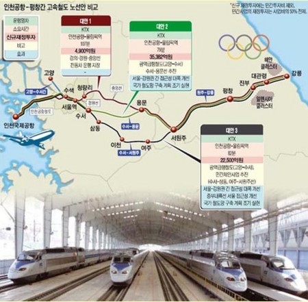 匿名を求めた国土海洋部の関係者は2日、「招致委の約束を履行するには仁川空港−平昌区間に時速250キロ台の高速鉄道を新設しなければならない」とし「費用と需要を考えれば事業性はないという結論が出た」と明らかにした。 また「仁川空港鉄道・京義(キョンウィ)線・中央線など既存線と原州(ウォンジュ)−江陵(カンルン)鉄道(予定)を活用する案を推進中」と説明した。 この場合、仁川空港−平昌間の所要時間は93分−107分となる。